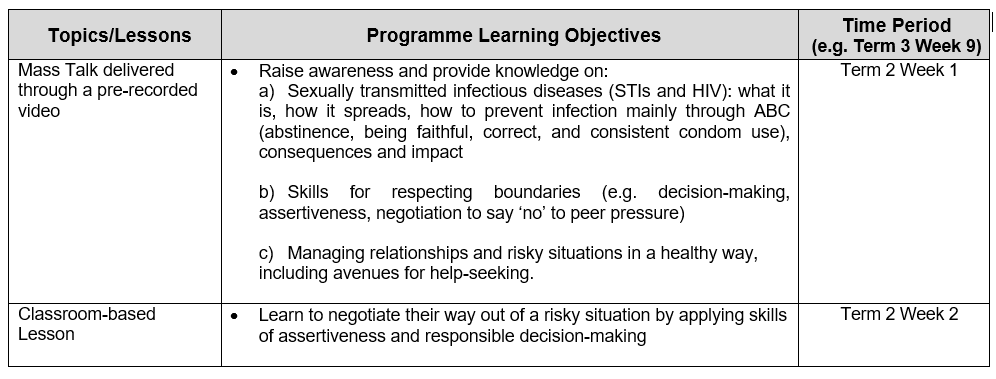 Students are taught skills such as decision-making, assertiveness and negotiation to say “no” to sex and negative peer pressure. They also learn that the impact of STIs/HIV extends beyond themselves and involves their family, and the importance of responsible decision-making and seeking help. Abstinence and upholding family values are the key messages.